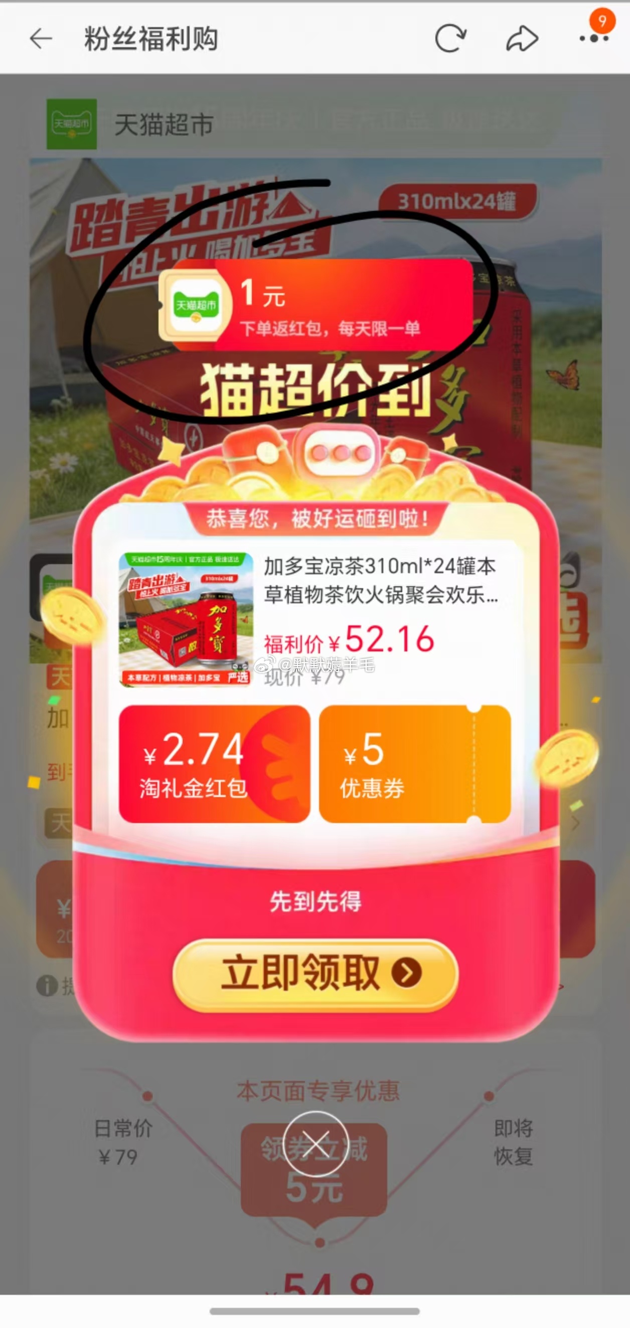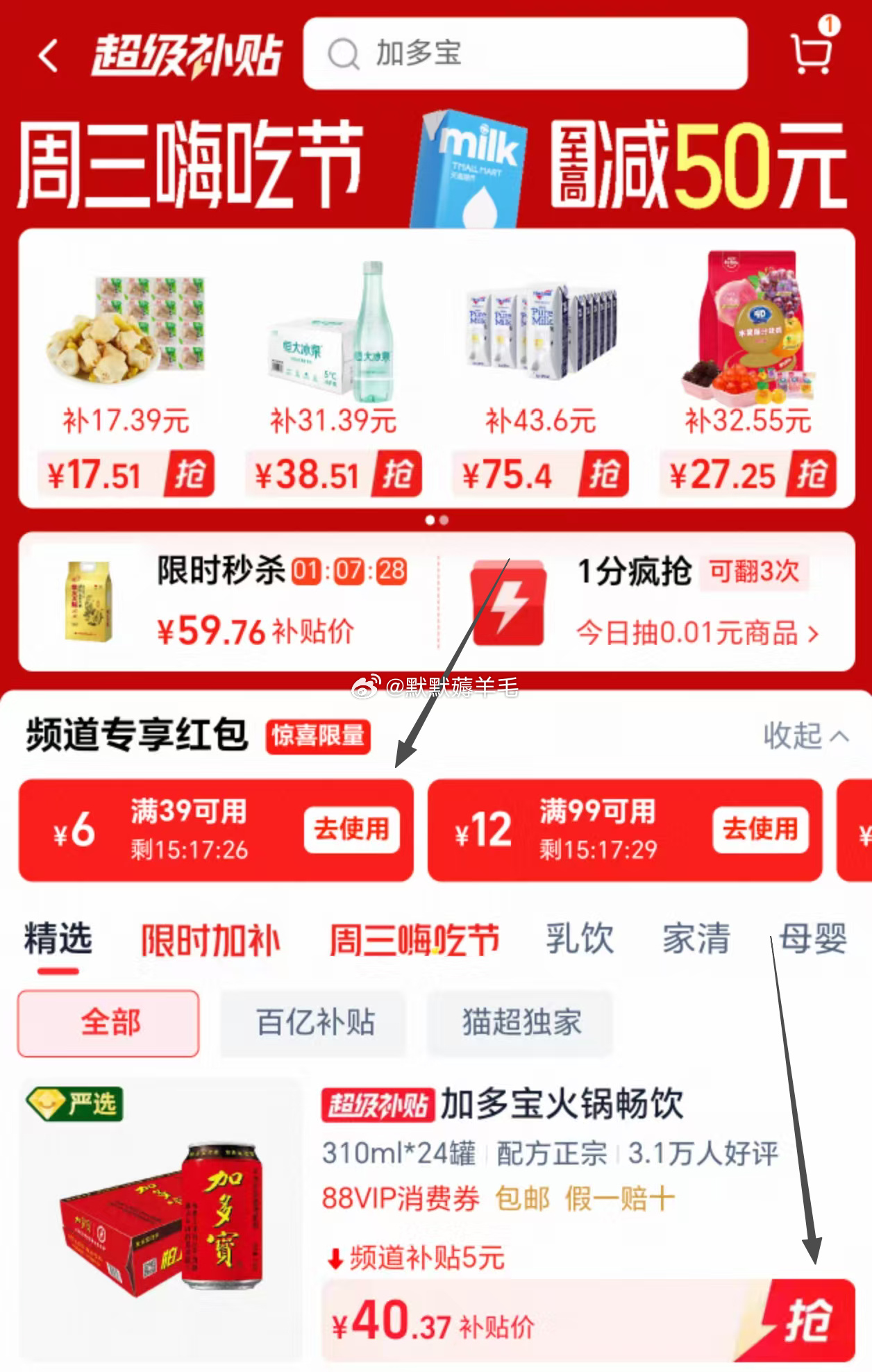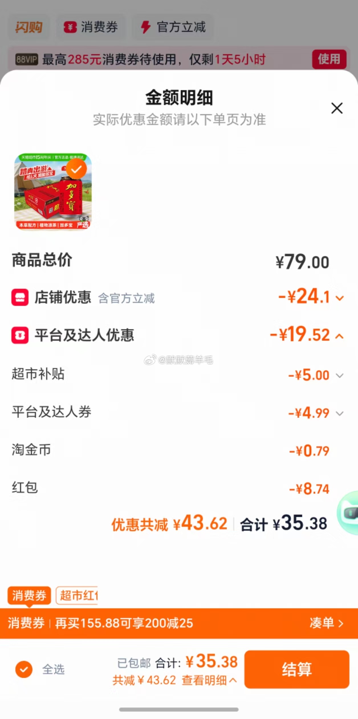 加多宝草本凉茶310ml*24罐【34.3,算上返1红包】加多宝凉茶310ml*24罐本草植物茶饮火锅聚会欢乐畅饮领弹窗礼金+券右上进直播间领9折券加购,再到超补加购,领39-6红包,回购物车数量改成1件