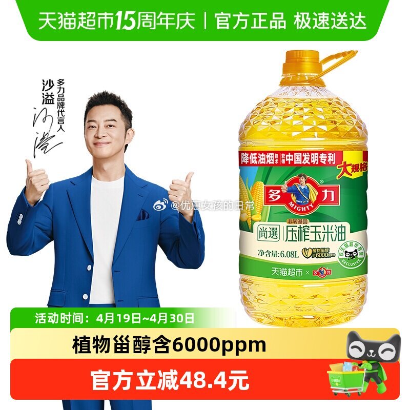 猫超 多力尚选压榨玉米油6.08L,领礼金多力尚选压榨玉米油6.08L清淡少油烟含维生素E 进入超级补贴领39-6红包,加购商品 商品下领99-10,如有2福袋【54.75】 (如返1猫超红包相当于到手53.75,每天返一次)