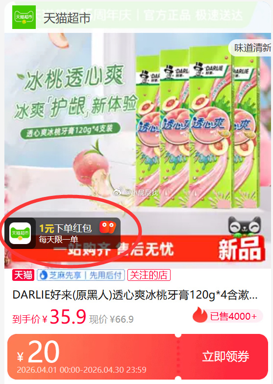 好来透心爽冰桃牙膏120g*4支DARLIE好来(原黑人)透心爽冰桃牙膏120g*4含漱口水成分清新口气网页链接 淘金币页面-我的足迹加购1件网页链接 凑200-25消费券+商品下方99-10券,15元福袋+88会员+淘金币抵扣完5.5凑单参考各1件【臻选】Driscolls怡颗莓云南蓝莓小果低GI脆甜多汁当季新鲜水果安踏泳衣女款专业竞速连体三角成人游泳馆专用高级感泳装2026新款