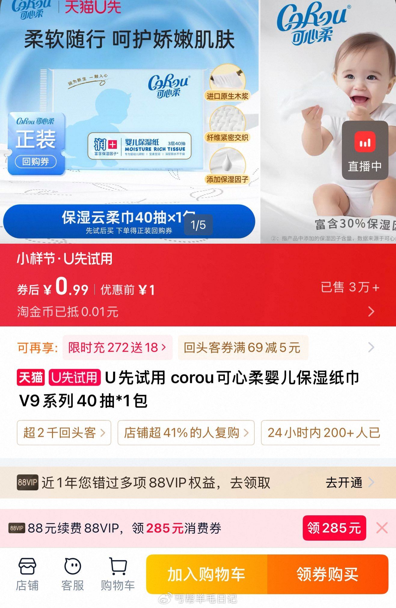 U先试用 corou可心柔婴儿保湿纸巾V9系列40抽*1包