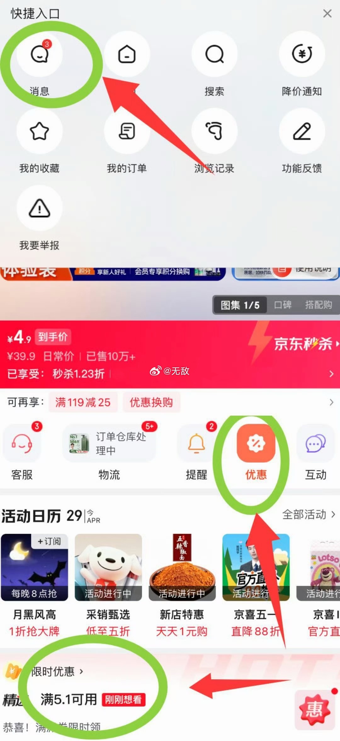 右下角砸蛋或去宝贝页面右上角消息-优惠有清洁5.1-5劵