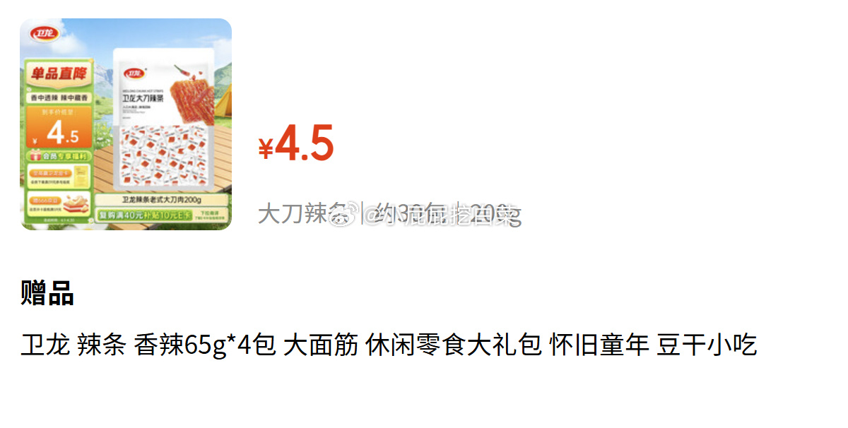 目前部分地区赠送:卫龙辣条香辣65g*4包