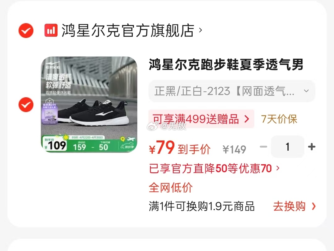 🏃♂️鸿星尔克慢跑鞋79元 领70-20补贴