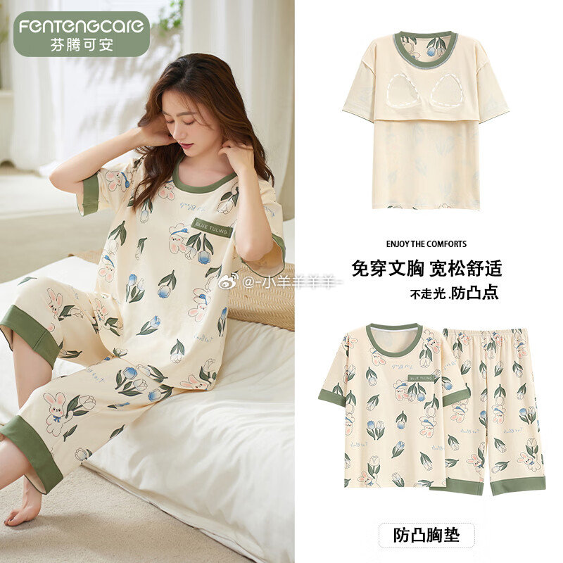 芬腾可安(FENTENGCARE)自带胸垫睡衣女士夏天短袖七分裤套装两件套休...