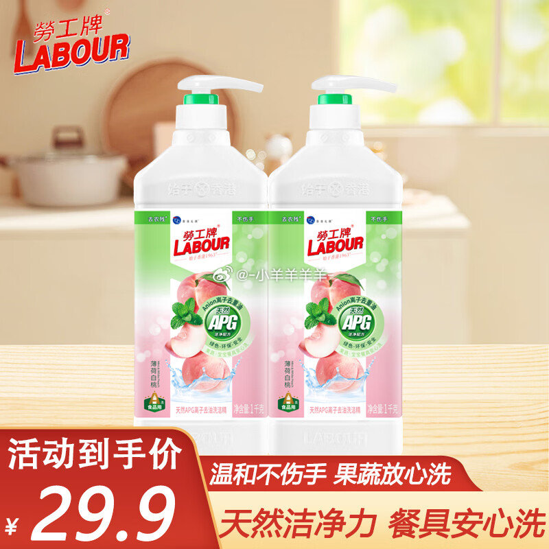 劳工牌APG洗洁精薄荷白桃1kg*2瓶首购18.9元