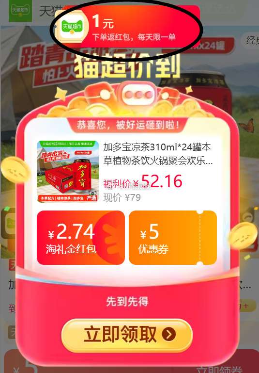 加多宝凉茶310ml*24罐,领2.74礼金+5券加多宝凉茶310ml*24罐本草植物茶饮火锅聚会欢乐畅饮①主图右上角进入直播间部分弹9折折扣券并加购1件②猫超首页进入超级补贴领39-6红包并加购1件购物车数量修改为1,到手35.38,返1元猫超红包