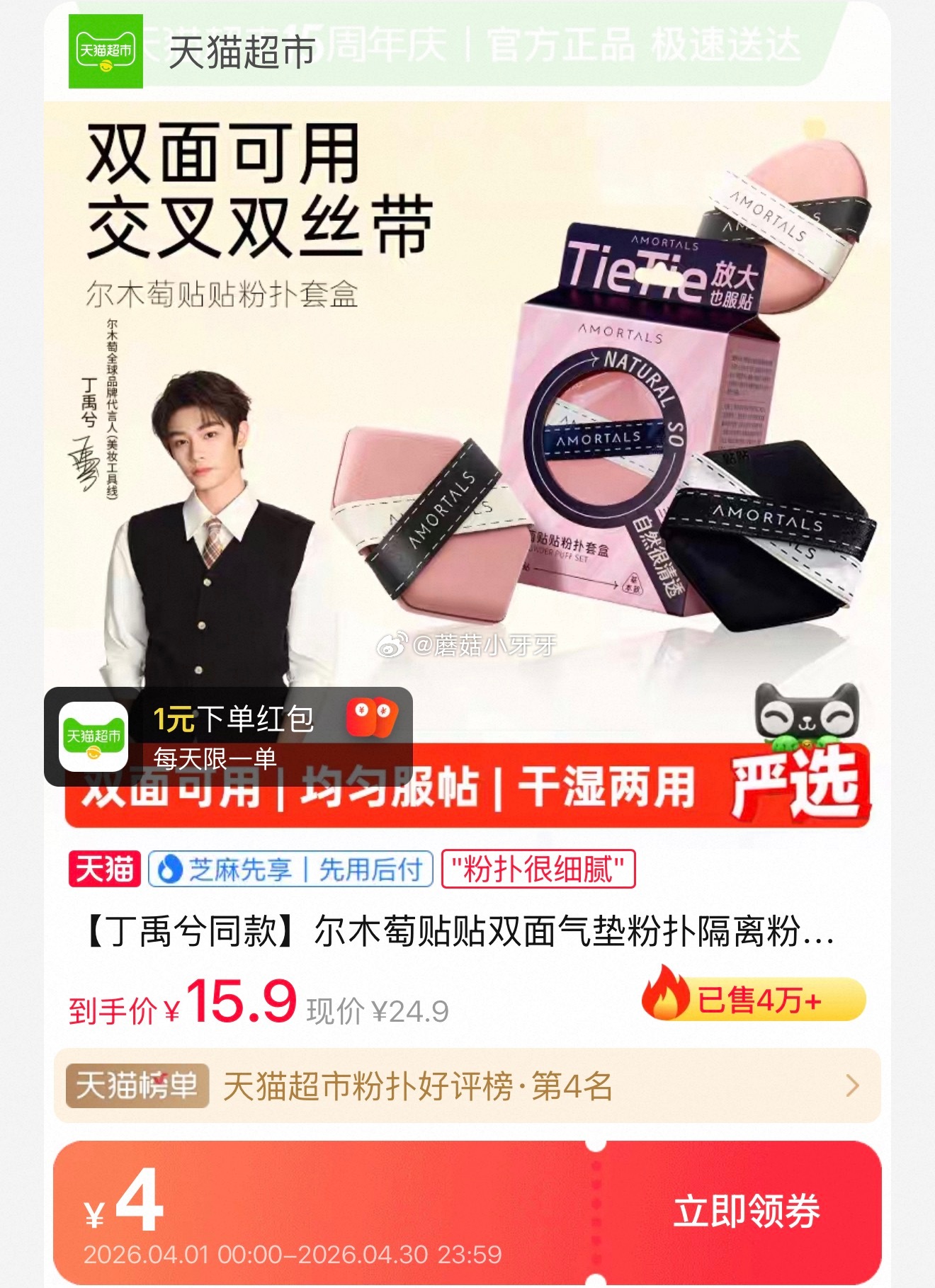 🐱超尔木萄贴贴双面气垫粉扑3枚tb搜:淘宝秒杀,部分弹1.8红包页面搜索产品下单,拍1件vip+金币+3福袋【9.81】(如返1猫超红包相当于到手8.81,每天返一次) 【丁禹兮同款】尔木萄贴贴双面气垫粉扑隔离粉底液专用干湿两用