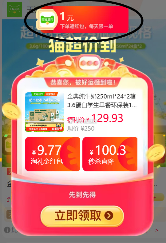 金典纯牛奶250ml*24*2箱,领9.77礼金金典纯牛奶250ml*24*2箱3.6蛋白学生早餐环保装1月产①手淘扫码图2进入淘宝秒杀直播间右上角惊喜权益领99-15红包②详情页进入淘宝秒杀后再按页面指引操作加购1件叠加商品下方99-10券,20元福袋抵扣完80.33