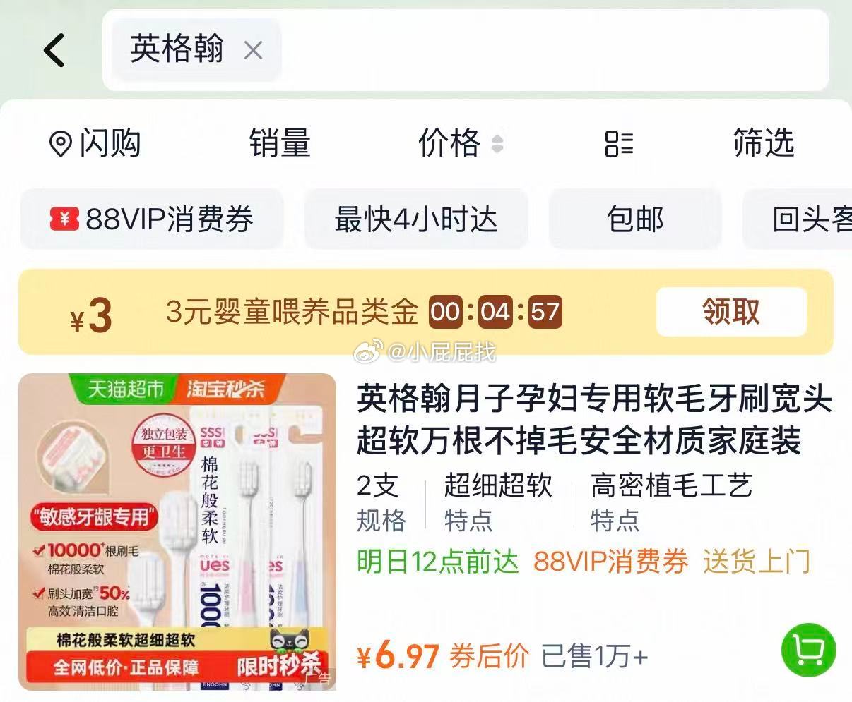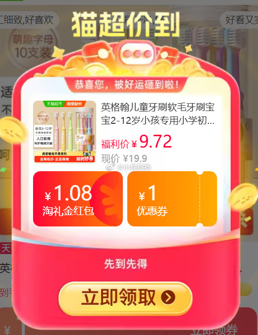 猫超首页搜【英格翰】部分账号有3元品类金英格翰儿童牙刷软毛牙刷10支,领1.08礼金+1券英格翰儿童牙刷软毛牙刷宝宝2-12岁小孩专用小学初中生换牙期网页链接 淘金币页面-我的足迹加购1件凑商品下方59-6券,2元福袋+88会员1.89凑单参考1件顺丰上门西域美农欧若姆高钙鲜牛乳饼干儿童饼干健康零食独立袋装