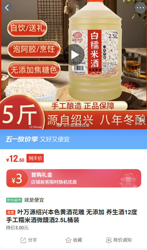 🎉10-2全品券!叶万源黄酒2.5L券后10.5元