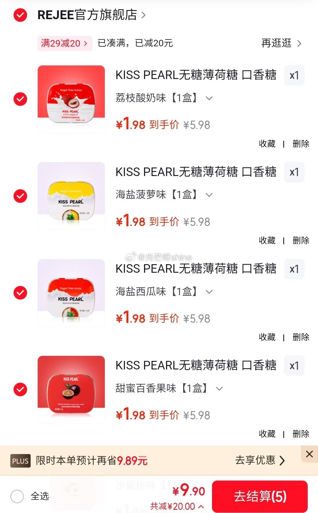 领29-20 网页链接 KISS PEARL无糖薄荷糖 口香糖水蜜桃味1盒,任选5件【9.9】 KISS PEARL无糖薄荷糖 口香糖 清新口气糖果零食 混合口味 水蜜桃味【1盒】 领60-41 网页链接 桃园建民 大花生106g/袋下酒菜熟花生米,任选6件【19.8】 桃园建民 桃园建民大花生106g/袋下酒菜熟花生米零食小吃下酒菜 麻辣大花生106g 1袋