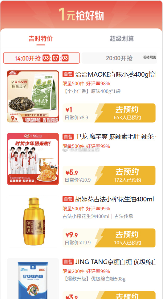 14点 网页链接 【吉时特价】页面下拉多款1元京东app顶部切换“特价”,可领取5.9-5券京东app顶部切换“特价”,再到9.9包邮栏,领4.9-4券网页链接 外卖29-20券网页链接 医疗器械膨胀券网页链接 汪贝秒杀网页链接 美妆秒杀