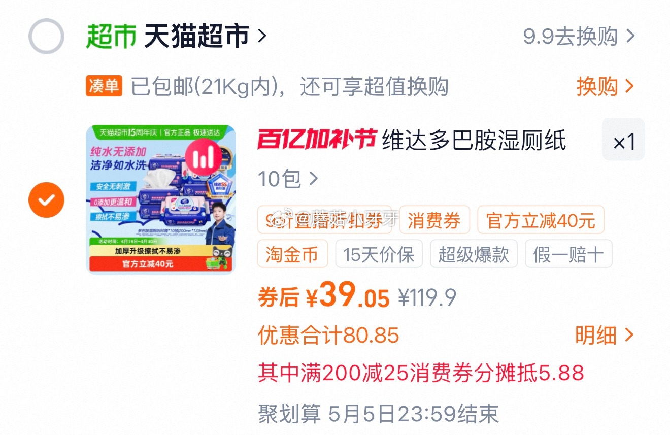 🐱超维达多巴胺湿厕纸80片10包,领礼金【详情享优惠】维达多巴胺湿厕纸纯水温和安全0添加湿巾右上角进入直播间领9折主播券,加购商品淘金币页面再加购(抵9.39),⚠️点开索引文章看方式合理凑单用200-25消费券网页链接商品下领99-10,拍1件vip+金币【39.05】(如返1猫超红包相当于到手38.05,每天返一次) 凑单拍1件安踏泳衣
