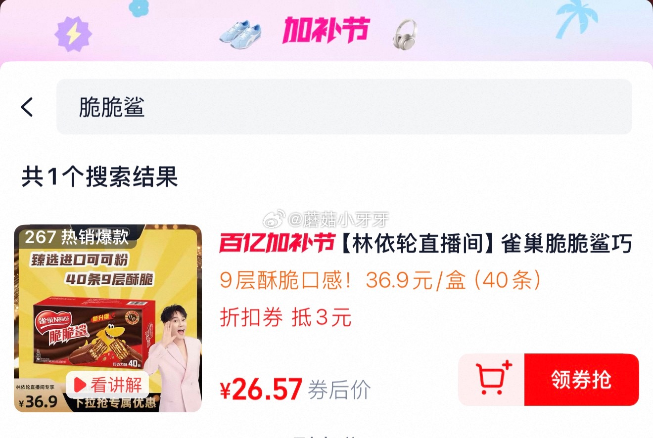 🐱超 雀巢脆脆鲨巧克力威化饼干18.6g*40条【下拉抢专属优惠】雀巢脆脆鲨巧克力威化饼干18.6g*40条休闲零食①超市首页搜索零食,部分有3品类金②扫图二进入直播间领9折券和5红包,加购267号商品③详情页进入超级补贴领39-6红包,再加购商品④合理凑单,拍1件vip【18.9】,提交订单抵扣品类金(如返1猫超红包相当于到手17.9,每天返一次) 凑单超级补贴加购拍1件福建红心芭乐番石榴脆甜多汁热带新鲜当季水果芭乐果整箱