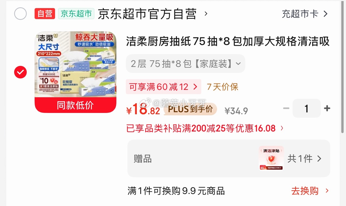 🐶东plus 200-25券网页链接洁柔 厨房抽纸75抽*8包加厚大规格2首单,凑后18.82,赠10元清洁津贴即到手【8.82】洁柔厨房抽纸75抽*8包加厚大规格清洁吸水吸油污一次性懒人抹布母亲节凑单网页链接