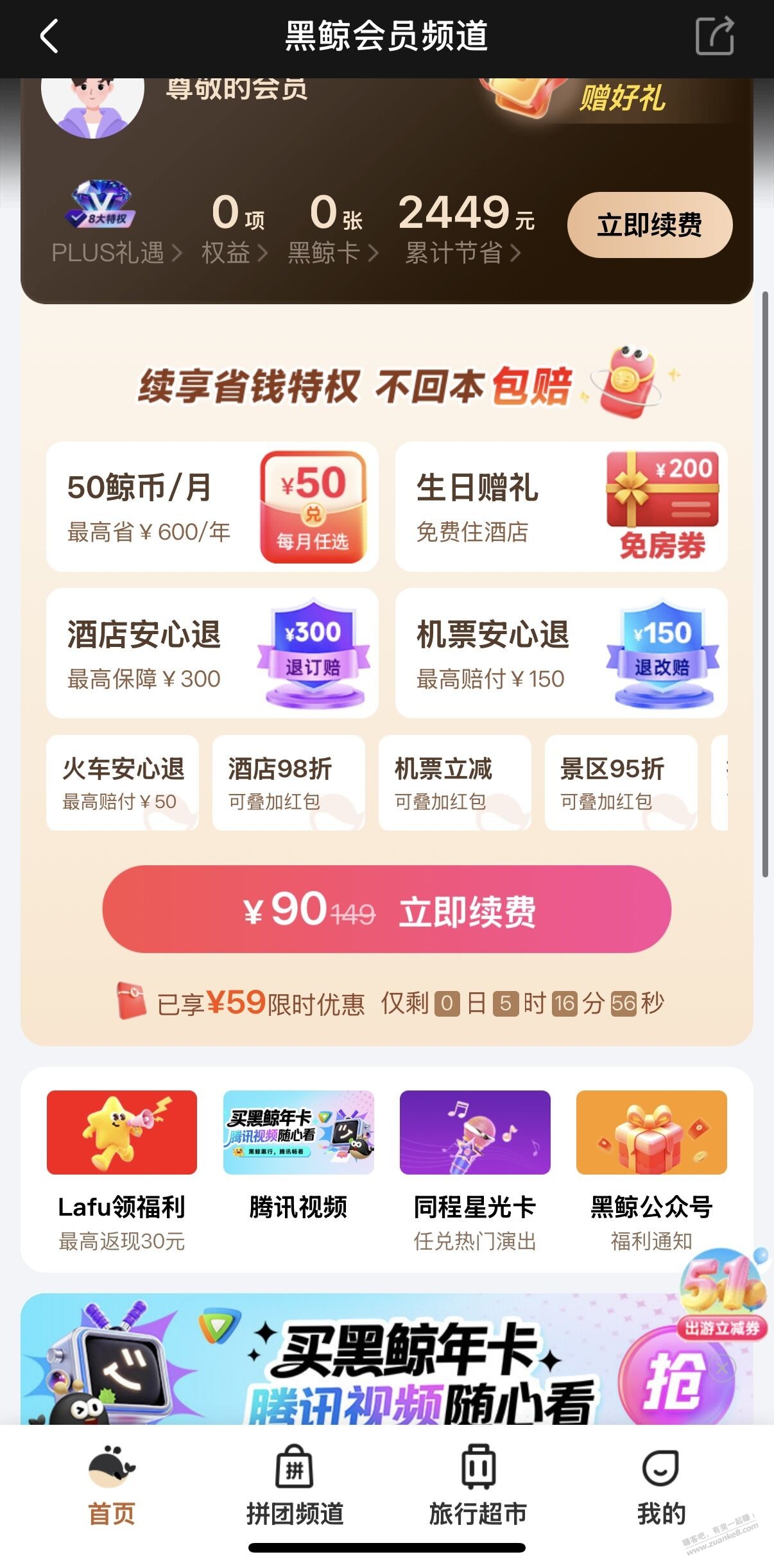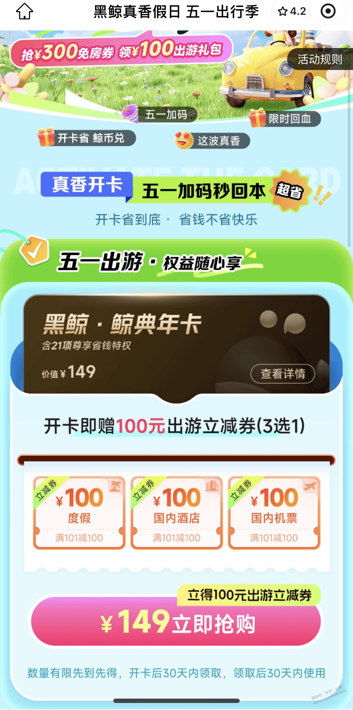 先进同程APP点续费/新开,一般都会送大额券,然后进黑鲸VIP公众号,点开最新那条活动,149开送三张100券,我选的酒店,然后进去付款,自动把APP的券叠加,我随机立减还减了几块,还倒挣钱,生日周可以领200房券,不是那种阉割版黑鲸 五一出游把100酒店券用了正好,每月鲸币换换打车券什么的,买不了吃亏买不了上当 本来不想发线报的,嫌麻烦又没收益,也算老人了,不希望赚吧就这样死掉,以后不忙能发就发