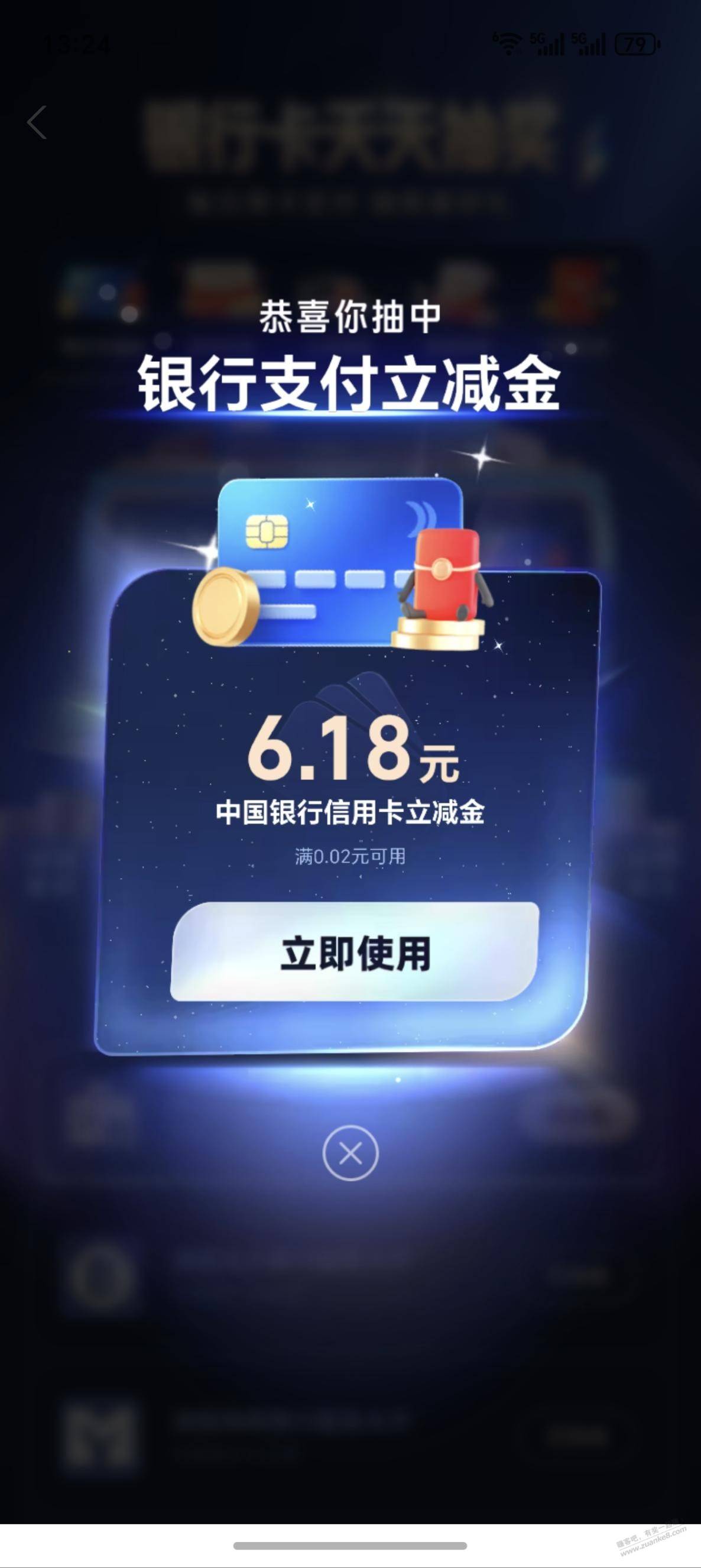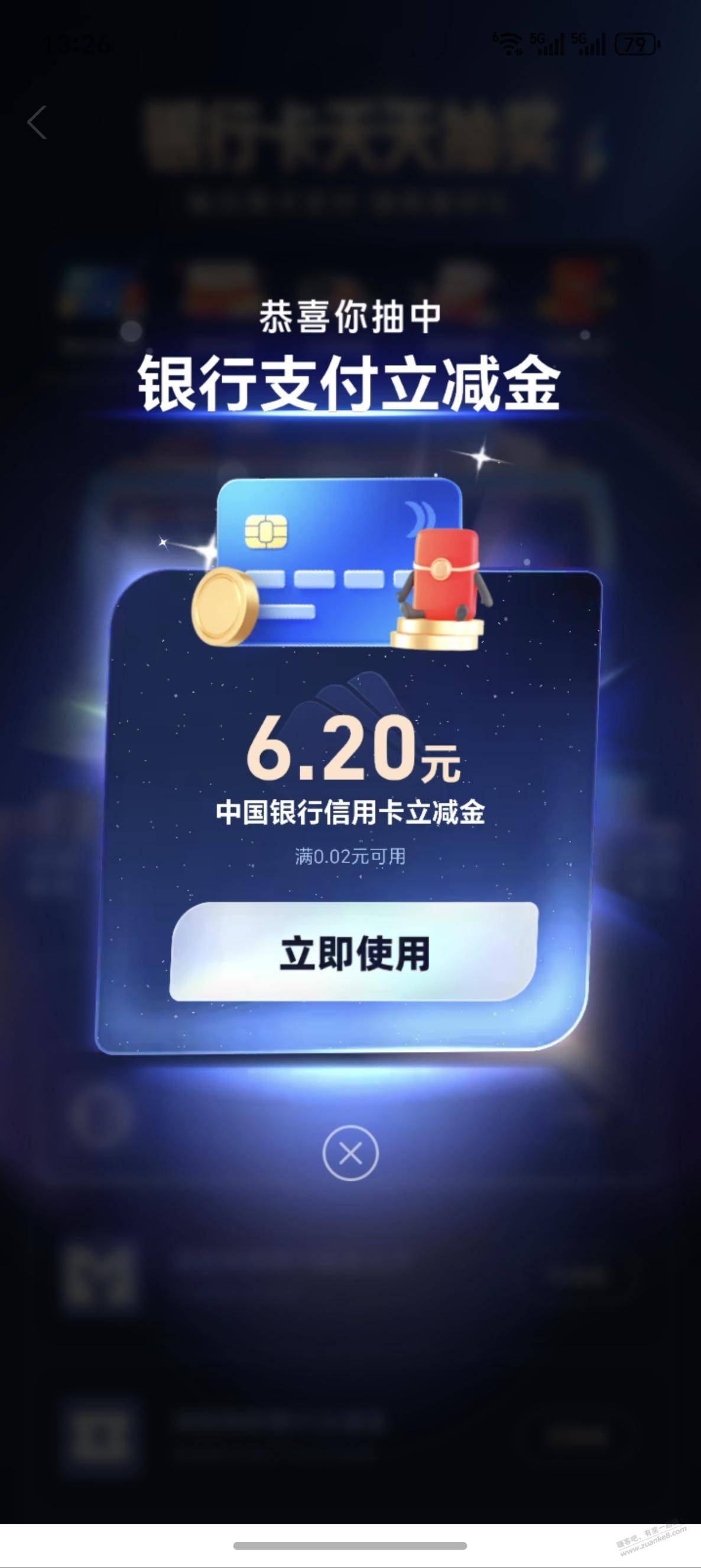 中了3次6.2,中国银行立减金,小号也有,可以试试