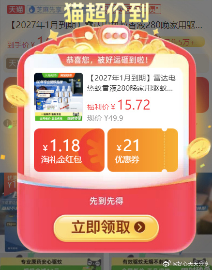 【猫超】淘宝搜省钱卡享15-3补贴红包!雷达电热蚊香液5液1器弹礼金,88vip拍下仅11.87元!🔥