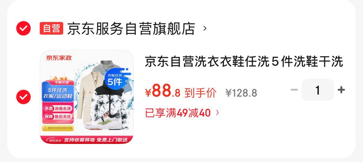 京东自营洗衣服务:领49-40券,衣鞋任洗5件88.8元