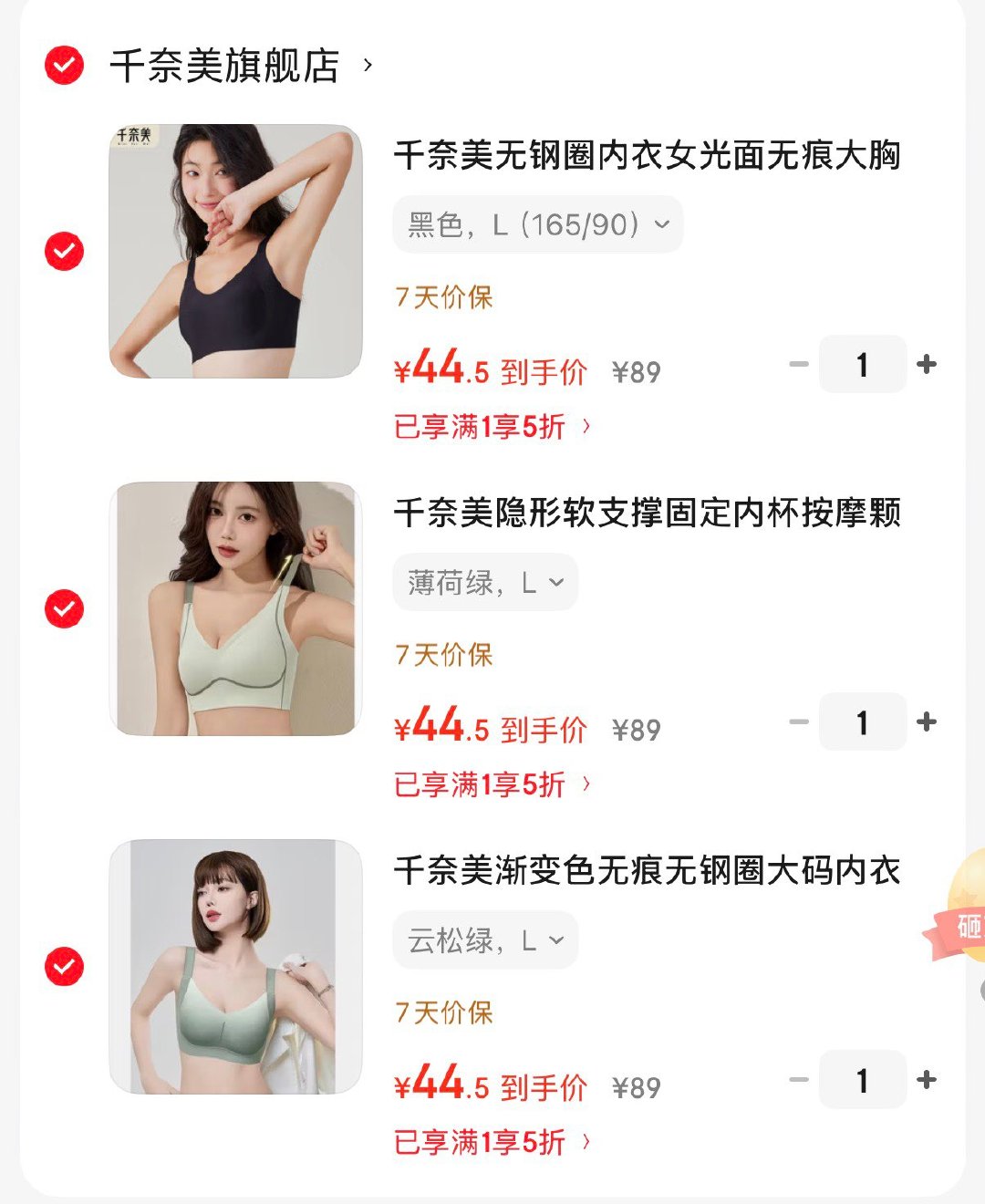 千奈美内衣任选1窾44.5亓 渐变无痕聚拢内衣 千奈美渐变色无痕无钢圈大码内衣提拉聚拢防下垂薄杯胸罩 云松绿 L 按摩颗粒侧收内衣 千奈美隐形软支撑固定内杯按摩颗粒侧收文胸 薄荷绿 L 光面无痕大胸显小内衣 千奈美无钢圈内衣女光面无痕大胸显小托胸侧收舒适文胸罩 肤色 L (165/90)