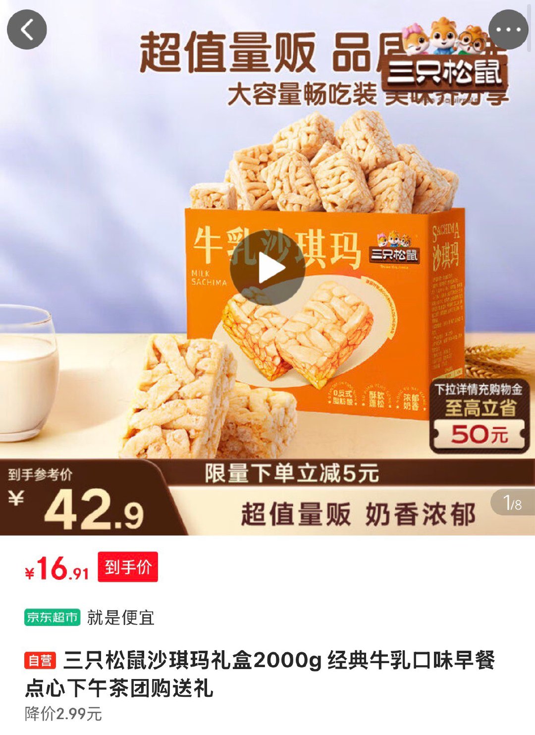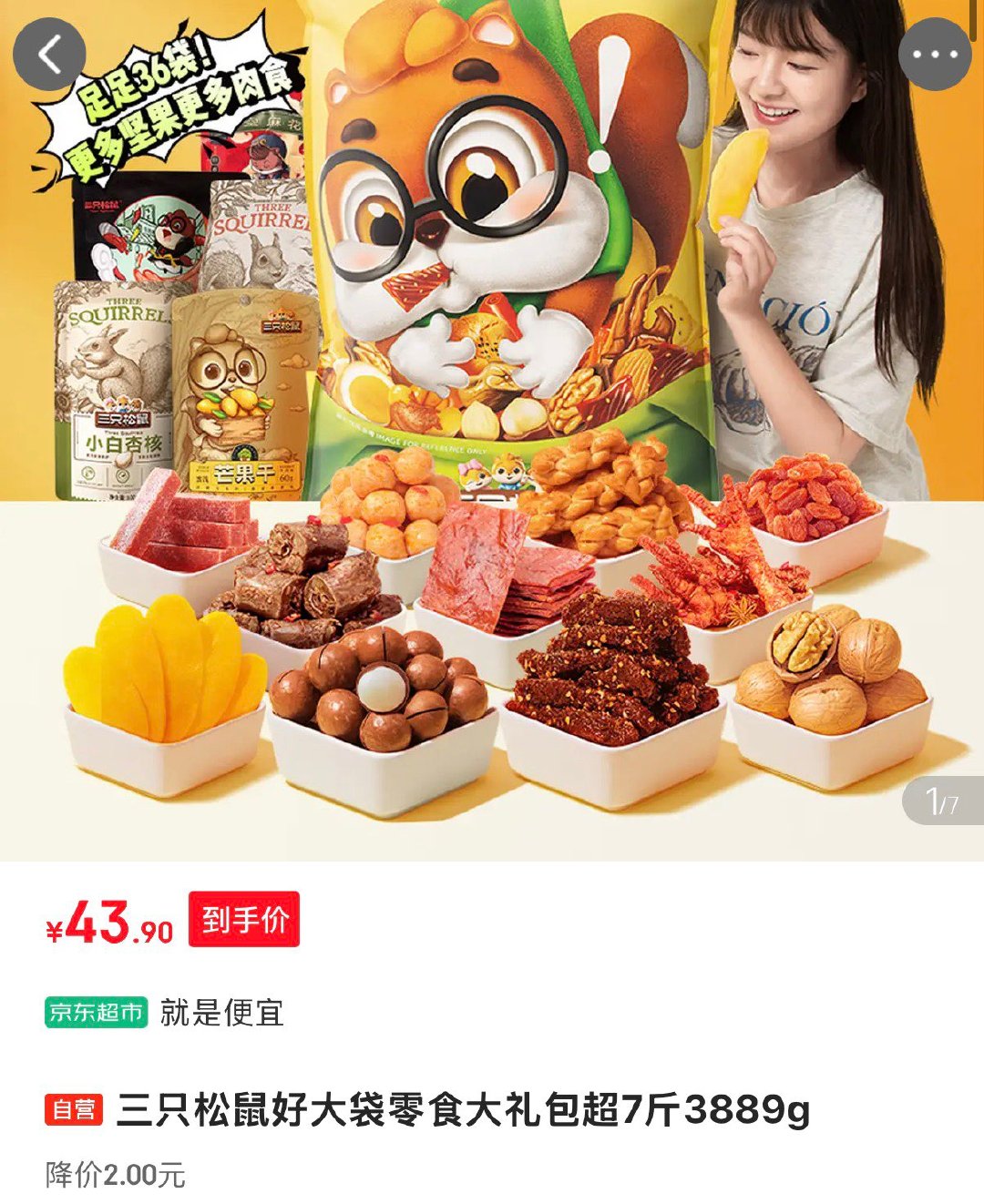 广州 杭州 成都地区 用3-2全品券43.9 三只松鼠好大袋零食大礼包超7斤3889g 三只松鼠好大袋零食大礼包超7斤3889g 广州地区 用3-2全品券 16.9 三只松鼠沙琪玛礼盒2000g 三只松鼠沙琪玛礼盒2000g 经典牛乳口味早餐点心下午茶团购送礼