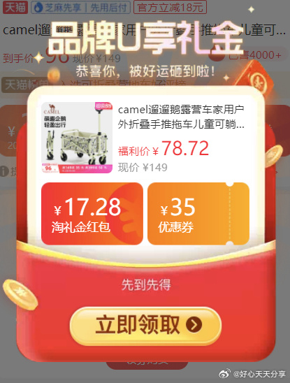 用200-25消费券网页链接骆驼camel 遛遛鹅露营车小推车 弹礼金camel遛遛鹅露营车家用户外折叠手推拖车儿童可躺野餐野营小推车从主图进店铺直播间,弹领9折券从177号加购用右边方法加购抵扣淘金币网页链接 再加购1件购物车数量修改为1 配合店铺充值购物金优惠 凑后【53.14】凑款361度童鞋儿童溯溪鞋凉鞋男童运动鞋夏季新款男孩鞋子户外鞋透气