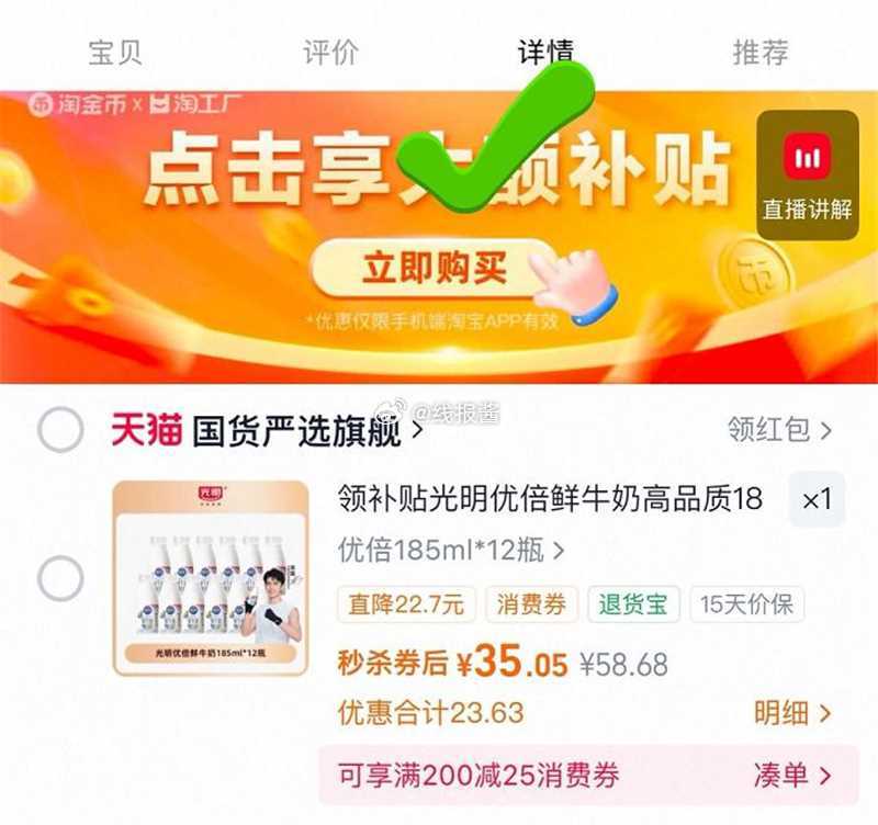 光明优倍鲜牛奶185ml*12瓶 35元补贴