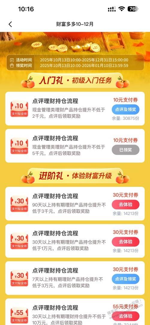 交行财富多多10-12月活动,买2000现金管理和3万 7天理财 确认后可以领10+30。另外财运多多看资产能不能领