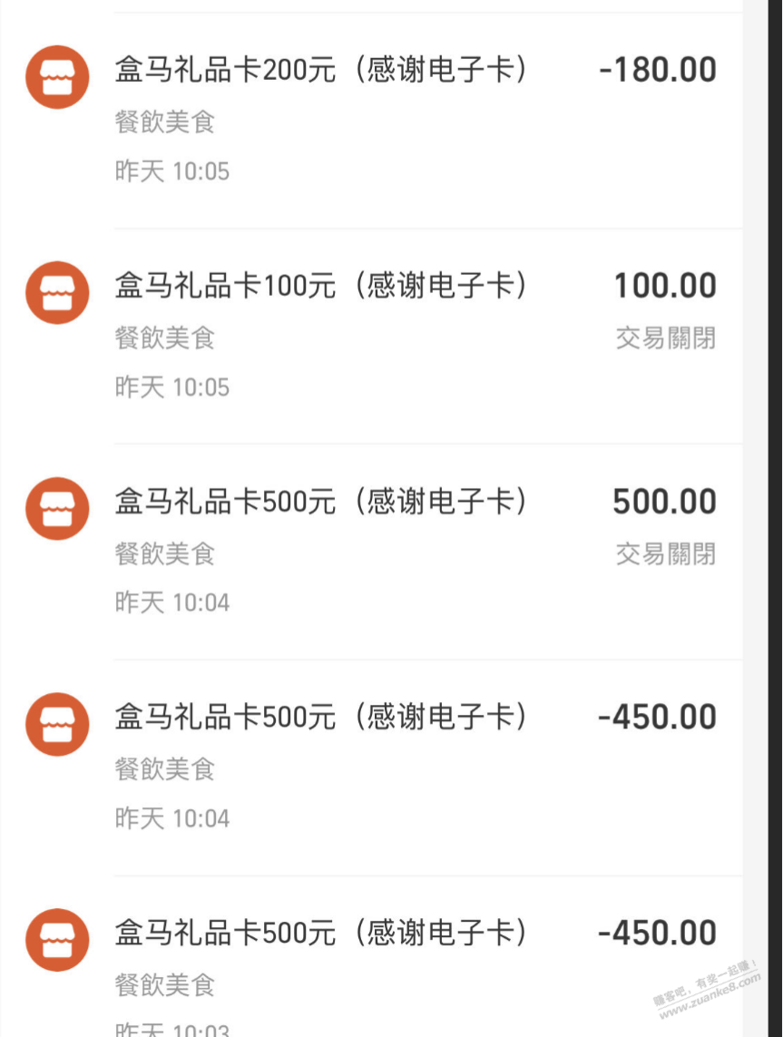 盒马app下单礼品卡,500-50,200-20各两笔,共4笔,速度,