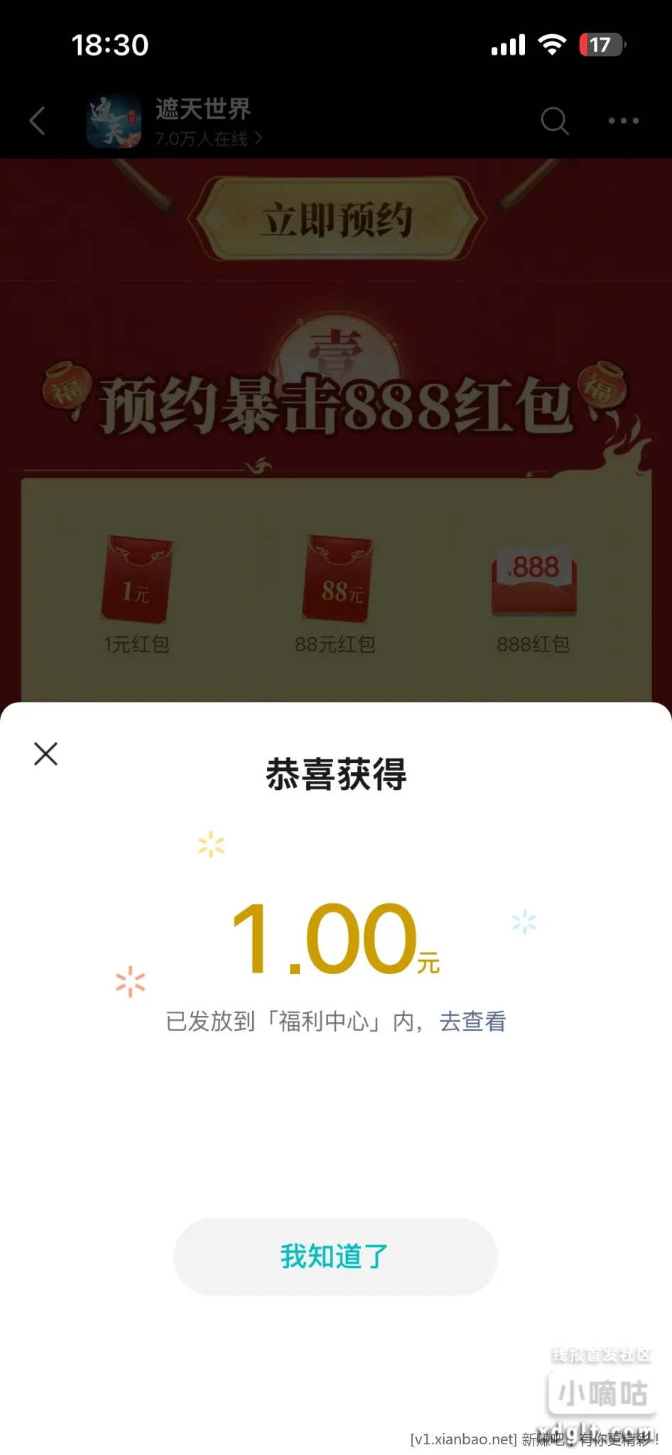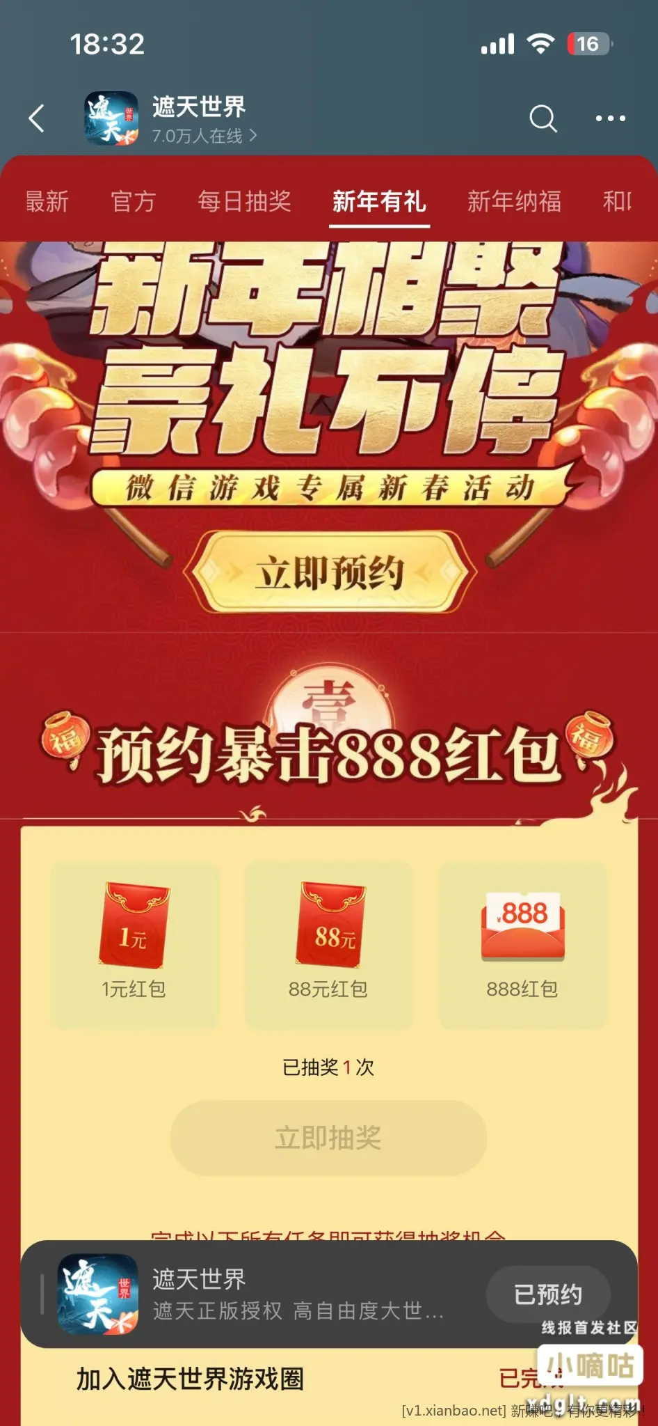 荒天帝的兄弟叶凡 预约得 1 元红包 游戏上线领 每天限量 1000 份 总共 20000 份 多号多撸 微信游戏-遮天世界-新年有礼