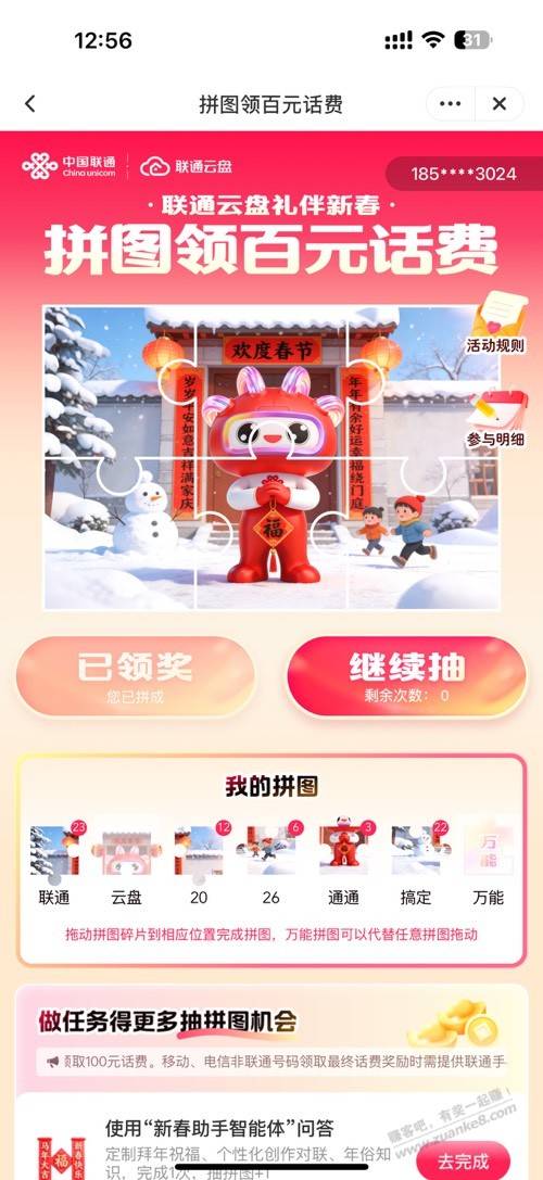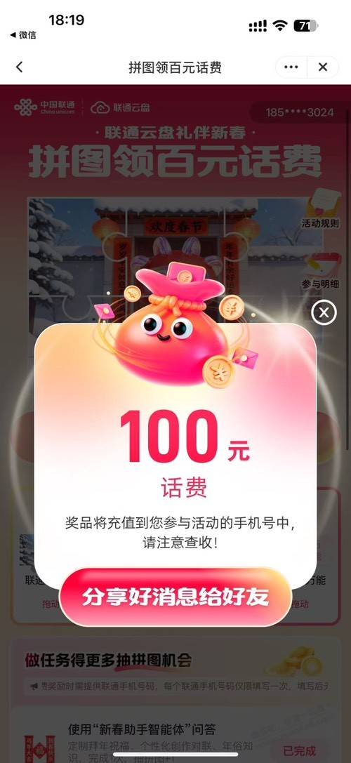 联通云盘APP集福话费100元