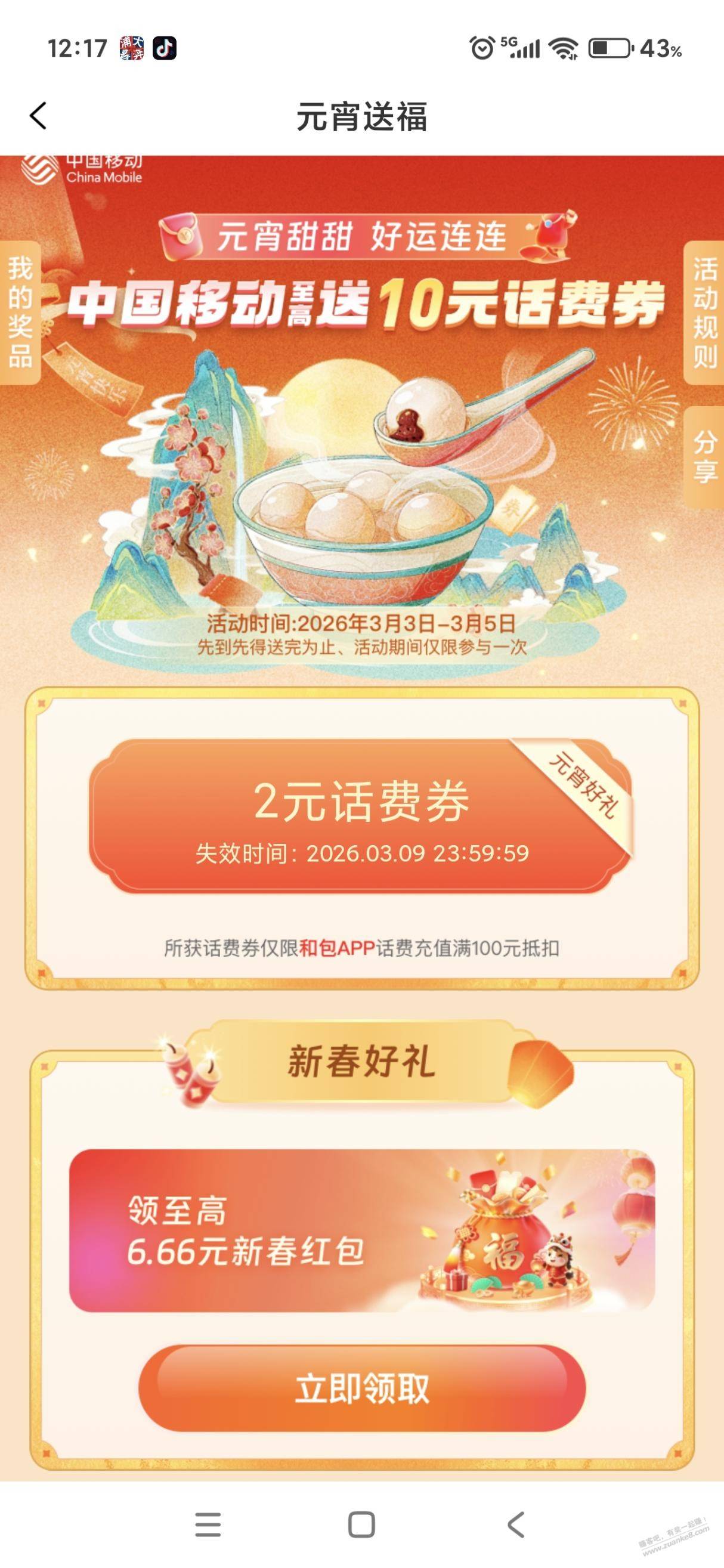 和包app,搜索元宵(页面两个话费优惠,第二个新春好礼概率100-6)