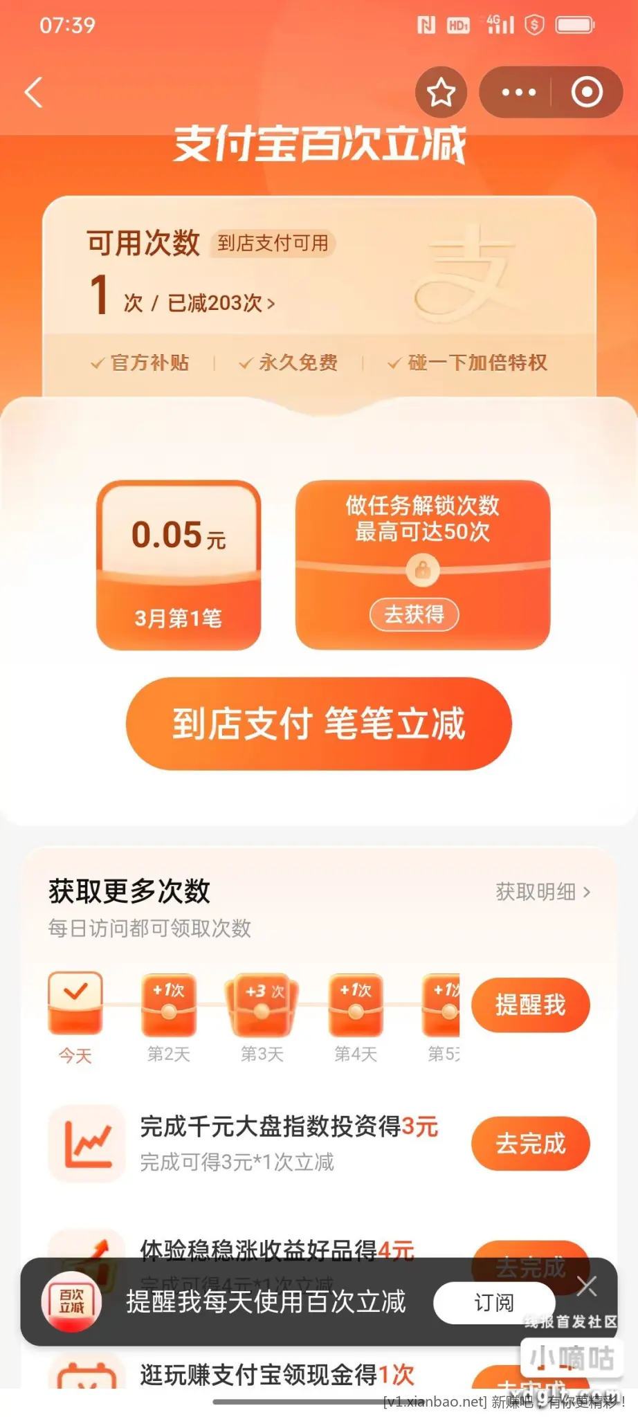 ZFB百次立减,千元大盘投资,买10领3红包,然后撤销!!!