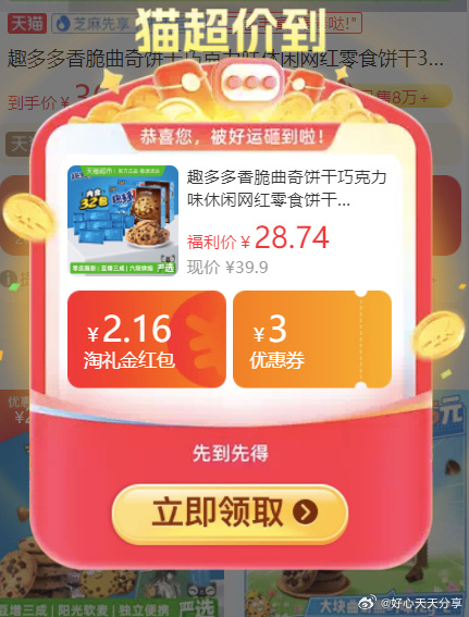 【猫超】部分账号标题下有2元福袋趣多多 香脆曲奇饼干巧克力味340g*2盒 弹礼金趣多多香脆曲奇饼干巧克力味休闲网红零食饼干340g*2盒散装32袋从主图右上角进入直播间,弹领9折券并加购用右边方法加购抵扣淘金币网页链接 再加购1件购物车数量修改为1 拍下88vip【15.69】