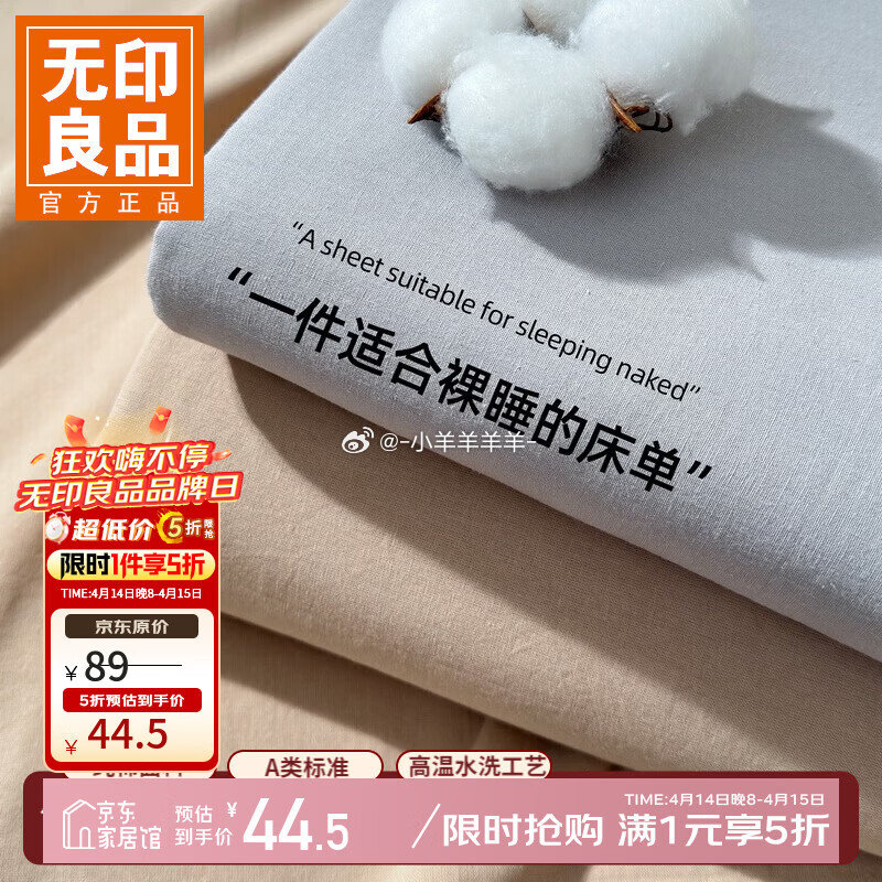 【无印良品】床品5折合集!! ①39.5元 水洗棉单床单 160*230cm 网页链接 ②34.5元 纯棉6层纱盖毯 90*100cm 网页链接 ③74.5元 坐床式三开门蚊帐 1.5*2m 网页链接 ④114.5元 纯棉三丽鸥套件 2*2.3m 网页链接