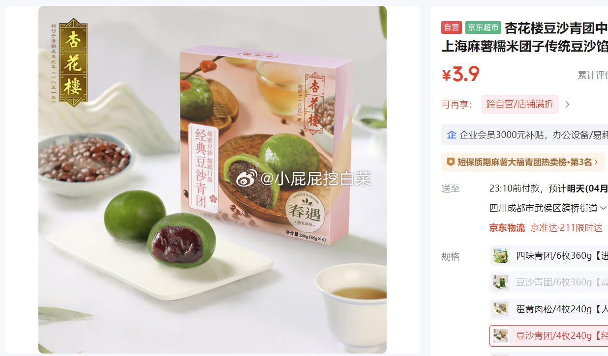 杏花楼豆沙青团 麻薯糯米团子240g,四川等地区3.9