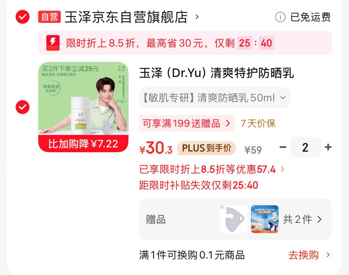 玉泽清爽特护防晒乳 温和兔卸50ml 弹9.1折立减,拍2件 单件30.3亓 贈:高夫小蓝盾防晒霜50ml 和玉泽定制口罩 玉泽(Dr.Yu)清爽特护防晒乳SPF42 PA+++大分子防晒 敏感肌温和免卸50ml