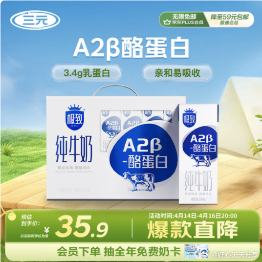 上海等地区京东福利:三元A2β酪蛋白牛奶整箱10盒仅10.9元!🥛