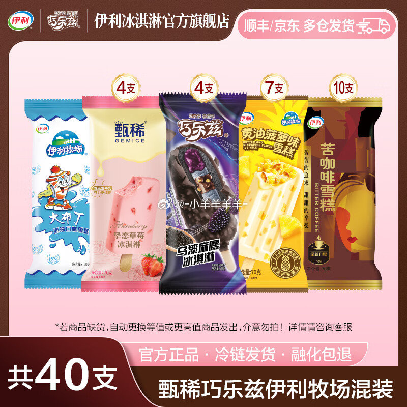 【伊利】冰淇淋合集 ①巧乐兹乌漆麻嘿组合40支 网页链接 拍下72元;才折1.8/支 ②巧乐兹热情桑芭组合35支 网页链接 拍下88.9元;折2.54/支 ③巧乐兹四个圈组合40支 网页链接 拍下100元;折2.5/支