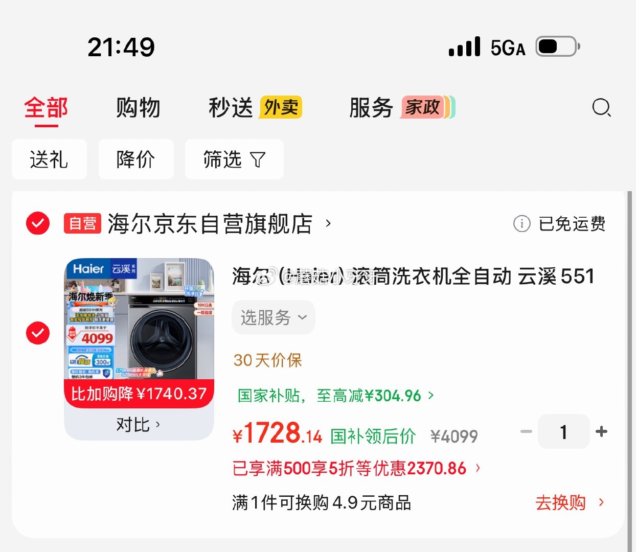 🐶东黑龙江有货 海尔洗衣机5折券1728.14元