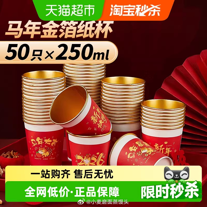 优奥马年金箔纸杯食品级加厚家用春节新年喜庆红色250ml*50只