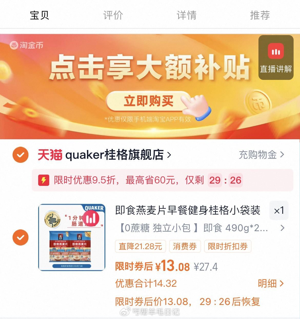 桂格即食纯燕麦片营养小袋便携装原味懒人速食冲饮健康早餐代餐