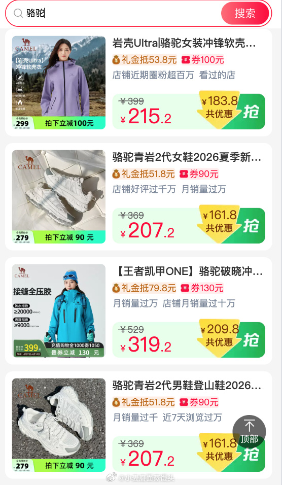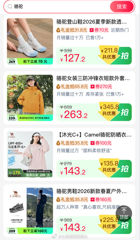页面搜“骆驼”,衣服鞋子都有,淘金币加购更低。