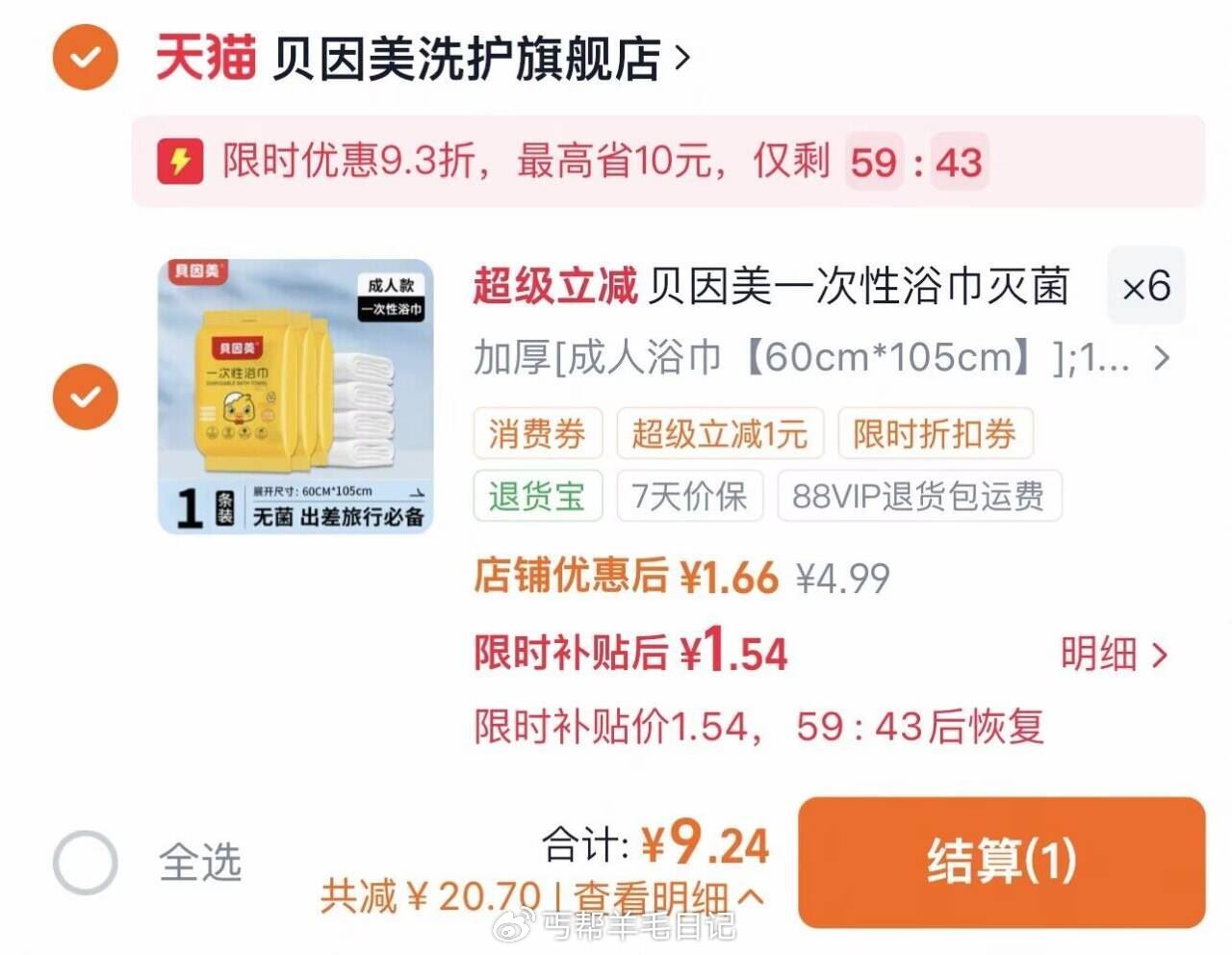 贝因美浴巾6袋限时9.2元‼️旅游出差便携加厚