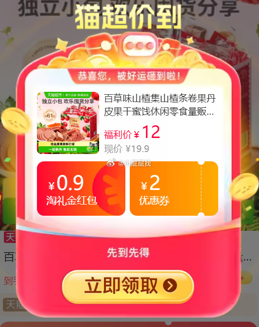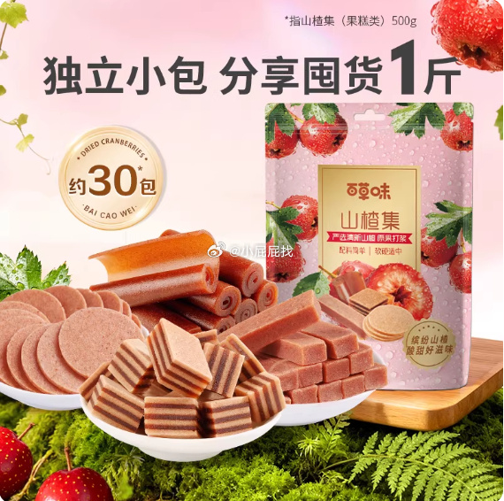 百草味山楂集500g,领0.9礼金+2券,详情页进入超级补贴加购1件