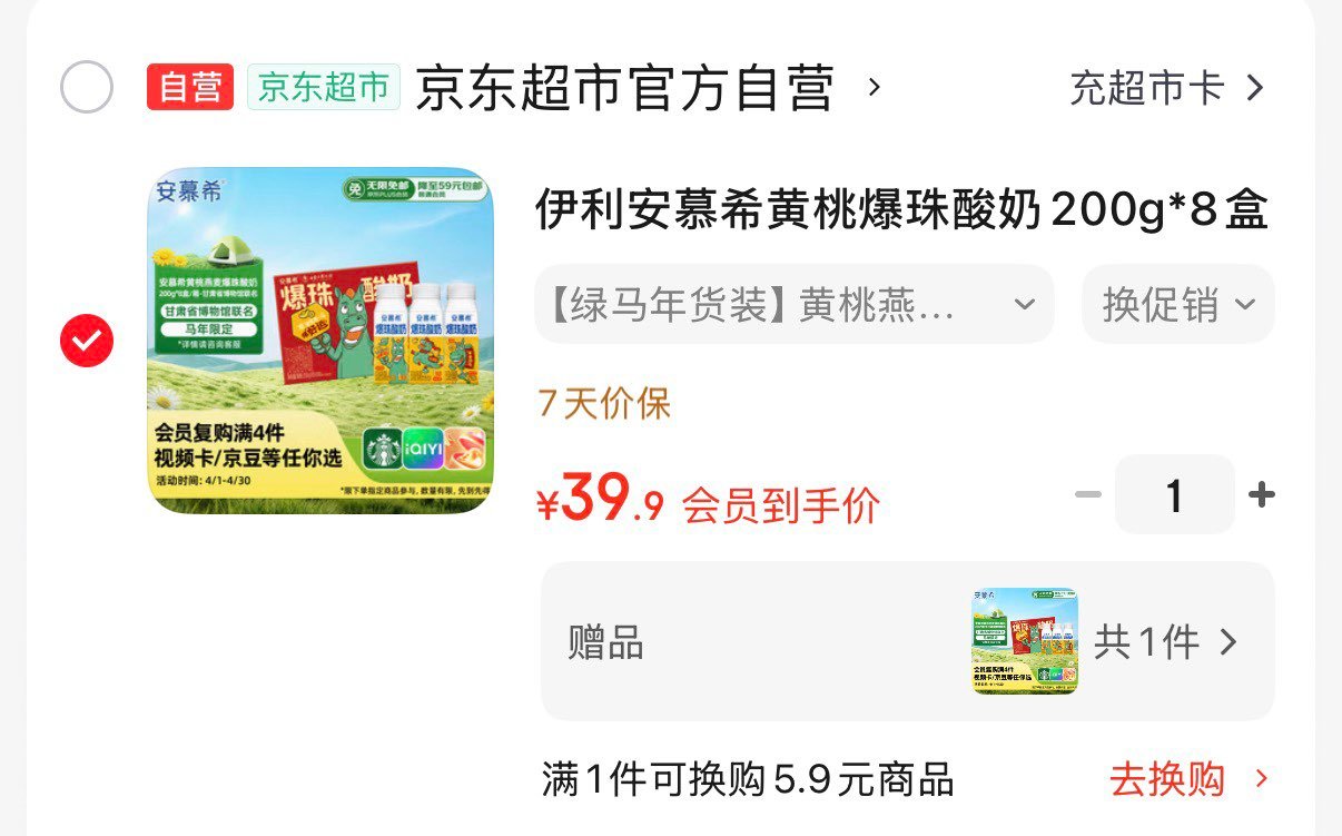 安慕希黄桃爆珠酸奶200g*8瓶入会39.9亓买1赠1到手16瓶