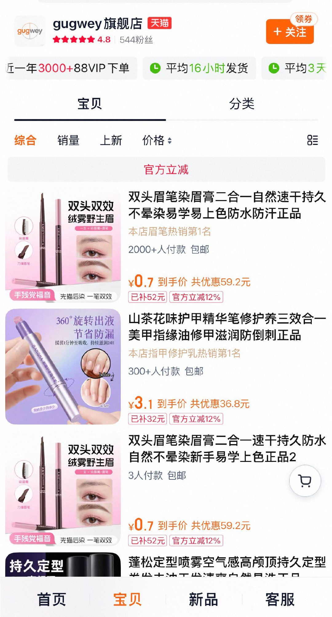 进店多款低价 关注店铺3券