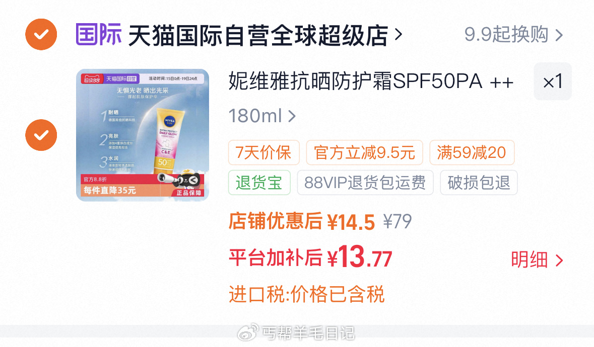 妮维雅防晒霜SPF50清透防晒180ml仅13.7元