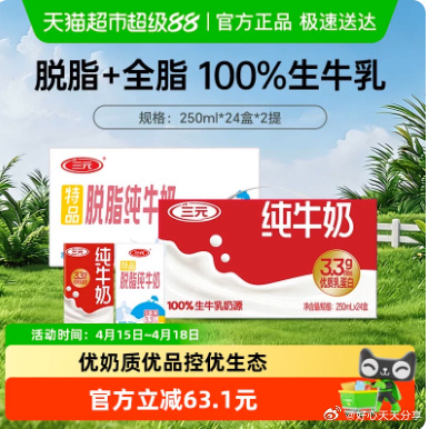 三元 纯牛奶全脂250ml*24+脱脂250ml*24 88vip【37.15】