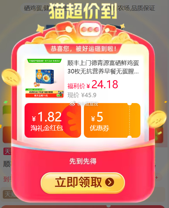 德青源富硒鲜鸡蛋30枚,领1.82礼金+5券顺丰上门德青源富硒鲜鸡蛋30枚无抗营养早餐无蛋腥味【详情页领券网页链接 淘金币页面-我的足迹加购1件凑商品下方59-6券,88会员+淘金币抵扣完15.14凑单参考1件江昊阳四川安岳黄柠檬尤力克当季现摘新鲜水果商用榨汁小金桔整箱